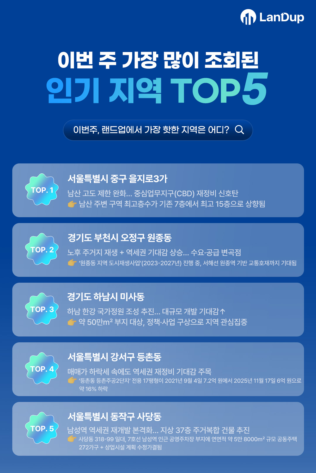 - 핵심 내용: 10·15 부동산 대책 이후 잠시 주춤했던 서울 아파트 매수 심리가 다시 살아났습니다. 특히 노·도·강(노원·도봉·강북구) 등 중저가 지역으로 수요가 확산되면서 매물 소진 속도가 빨라지고 있습니다. - 변화 요인: 서울 아파트 매매수급지수는 102.3으로 100선을 넘어, ‘사는 사람이 더 많다’는 신호를 나타냈습니다. 강남(103.8)과 동북권(99.3) 모두 지수가 상승하며 매수세가 확대되고 있습니다. - 중요성: 중저가 아파트를 중심으로 거래가 활발해지면서 가격 상승 폭도 확대되고 있습니다. 노·도·강 지역은 4주 만에 상승 폭이 커져, 저가 매물이 빠르게 소진되는 시장 패턴이 형성되고 있습니다. - 미래 전망: 전문가들은 서울 아파트가 규제에도 쉽게 하락하지 않을 것으로 보고 있습니다. 교통·생활 인프라가 양호한 중저가 주택부터 가격 상승 → 매물 소진 사이클이 이어질 가능성이 높습니다.
